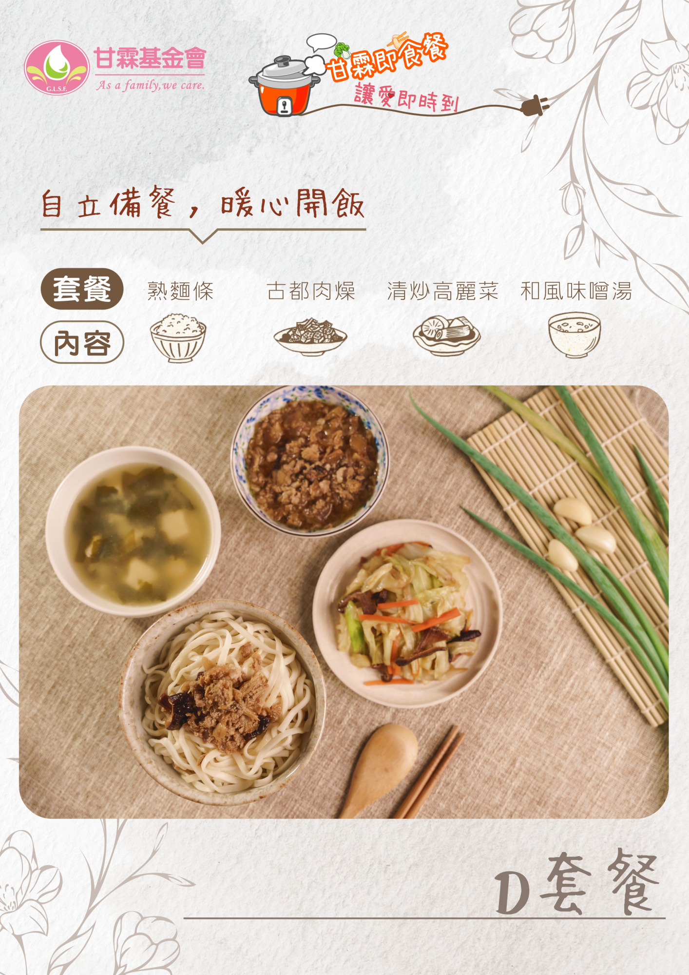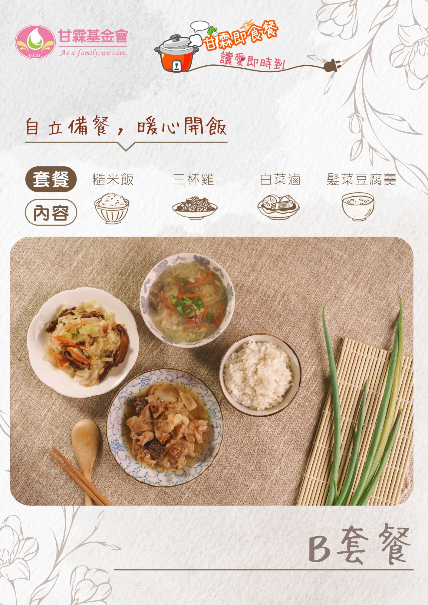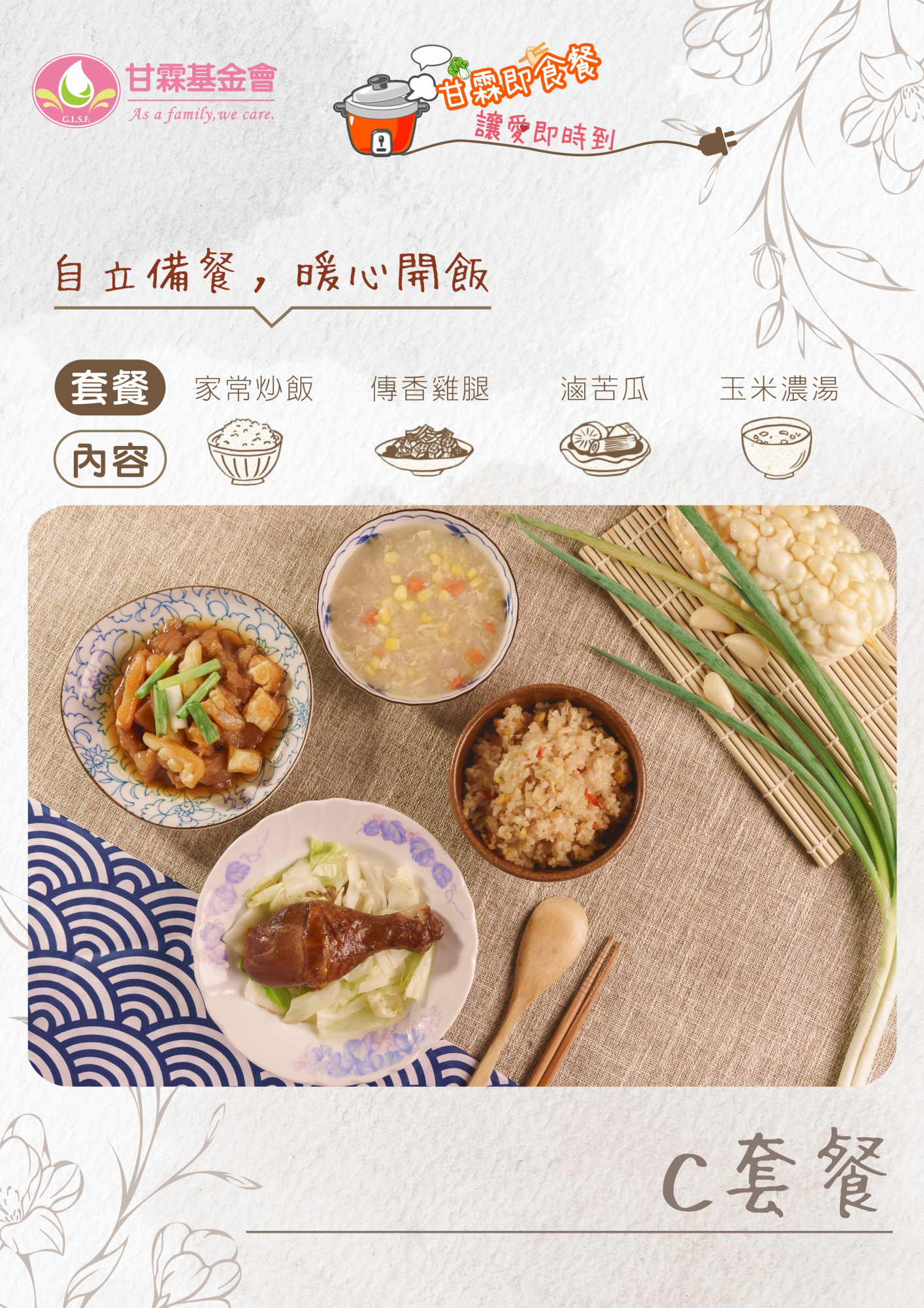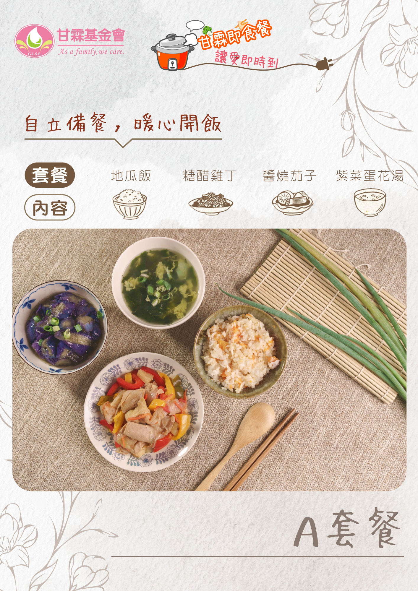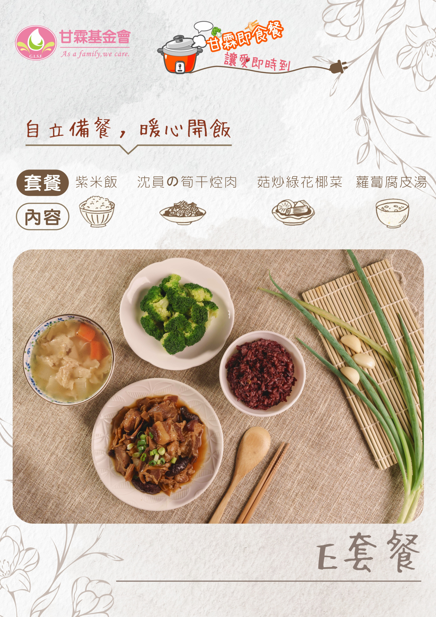 為了讓更多獨居長輩能穩定自理晚餐,我們推出【甘霖即食餐,讓愛即時到】預購義賣計畫